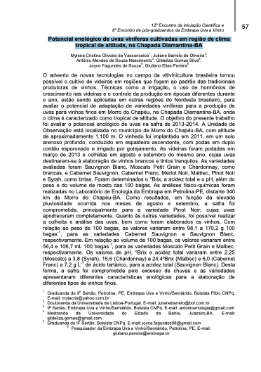 Conheça o estudo da Embrapa que mostra o potencial enológico de uvas viníferas cultivadas em região de clima tropical de altitude, na Chapada Diamantina-BA. Clique na imagem da página para abrir o arquivo em PDF.